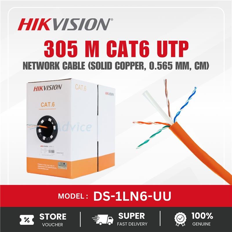 The Hikvision DS-1LN6-UU is a high-quality CAT6 UTP network cable designed to provide reliable data transmission for networking and surveillance installations. Supplied in a 305-meter box, this cable is suitable for large-scale wiring projects such as office networks, IP camera systems, data communication infrastructure, and structured cabling installations. It is constructed with solid copper conductors measuring 0.565 mm in diameter, which ensures stable electrical performance, improved signal transmission, and reduced resistance compared to copper-clad alternatives. As a Category 6 unshielded twisted pair (UTP) cable, the DS-1LN6-UU supports high-speed data transfer and stable network communication for Gigabit Ethernet applications. The twisted-pair design helps minimize electromagnetic interference and crosstalk between cable pairs, allowing consistent signal quality across long distances. The cable also complies with CM (Communication Multipurpose) fire safety standards, making it suitable for indoor installation in commercial and residential environments. Commonly used in IP surveillance systems, enterprise networks, and structured cabling projects, this cable provides dependable connectivity for network switches, routers, access points, and IP cameras. With its solid copper construction, durable insulation, and long-length packaging, the Hikvision DS-1LN6-UU offers an efficient and reliable solution for professional network infrastructure deployment.