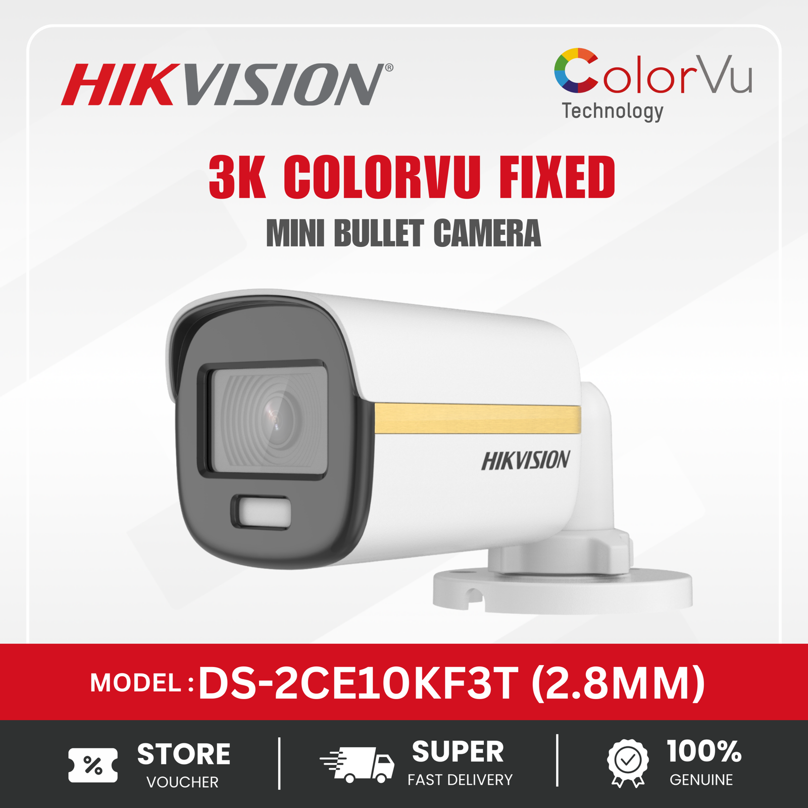 The DS-2CE10KF3T (2.8mm) is a high-performance 3K ColorVu bullet camera designed to deliver exceptional image clarity and vivid color reproduction around the clock. With its 2.8mm wide-angle lens, the camera provides an expanded field of view ideal for monitoring open indoor or outdoor areas. Equipped with advanced ColorVu technology, it captures bright, full-color video even in extremely low-light environments, ensuring critical details are always visible. The camera supports high-definition output for clean and accurate footage, making it suitable for homes, offices, shops, and small commercial spaces. Its durable, weather-resistant housing ensures long-lasting performance in various weather conditions. Easy installation and compatibility with TVI systems make the DS-2CE10KF3T a dependable and cost-effective solution for modern surveillance needs.