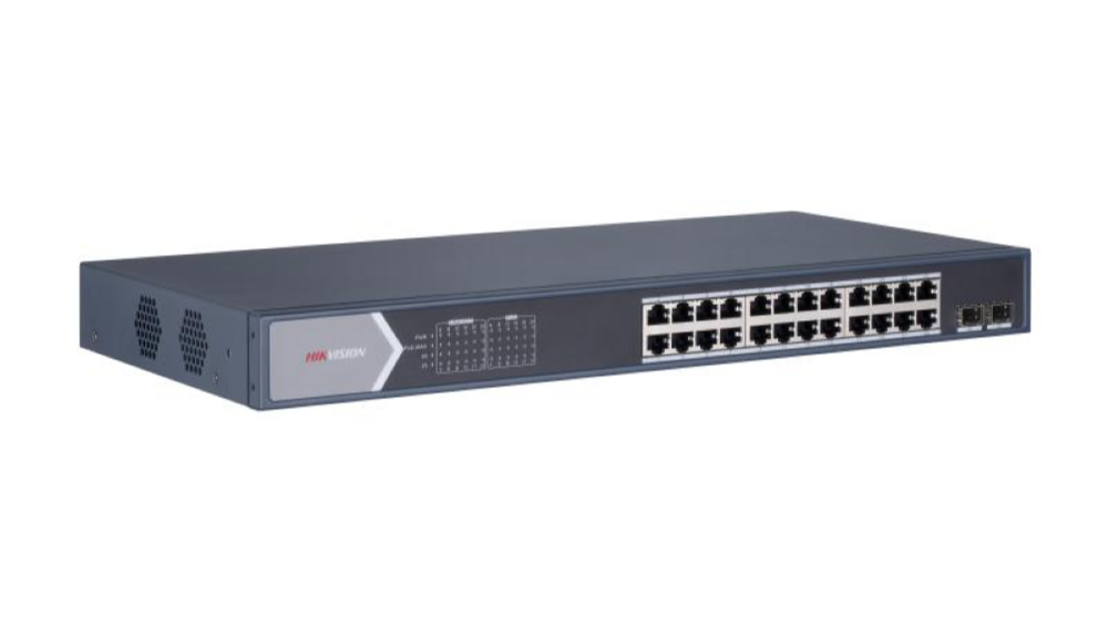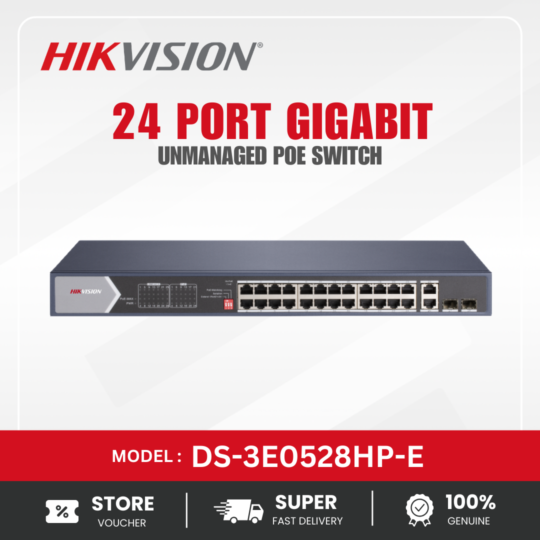 The Hikvision DS-3E0528HP-E is a 24-port Gigabit unmanaged PoE switch designed to provide efficient network connectivity and power delivery for surveillance systems and enterprise network environments. It features 24 × 10/100/1000 Mbps PoE ports along with two Gigabit uplink ports, allowing stable high-speed communication between network devices and the main network infrastructure. This switch is widely used in IP camera installations, office networks, and other applications that require reliable data transmission and centralized power distribution. The device supports IEEE 802.3af and IEEE 802.3at Power over Ethernet standards, delivering up to 30 W of power per port, which allows connected devices such as IP cameras, wireless access points, and VoIP phones to receive both power and data through a single Ethernet cable. With a high total PoE power budget, the switch can support multiple PoE devices simultaneously, making it suitable for medium to large surveillance deployments. As an unmanaged switch, the DS-3E0528HP-E is designed for simple installation and operation without complex configuration. It offers plug-and-play functionality, enabling quick integration into existing network infrastructures. The switch also includes features such as PoE watchdog, surge protection, and intelligent power management, which help maintain stable network performance and automatically restart unresponsive devices when necessary. Built with a durable metal housing and efficient heat dissipation design, the switch ensures reliable long-term operation in demanding environments. With its combination of high-speed Gigabit connectivity, stable PoE power delivery, and easy deployment, the Hikvision DS-3E0528HP-E provides a dependable networking solution for modern IP-based surveillance and communication systems.